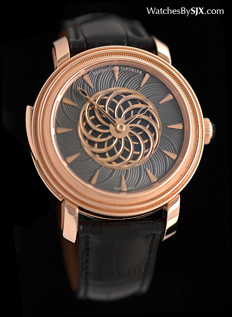 De wijzerplaat is gemaakt van massief goud, met een spiraalvormige guilloche de cijferrand en opengewerkt in het midden van een waaiervormige opening te vormen. Achter deze opening is een parelmoer schijf met een turbine-achtige motief dat draait wanneer de repeater is geactiveerd. De beweging in de hand wordt gewikkeld, met twee dom gongs ongewoon vorm van een slang. Twee maal zo lang als de omtrek van de beweging, de gongs een bel die blijft hangen. Bekijk meer replicas horloge en rolex Zwitserse